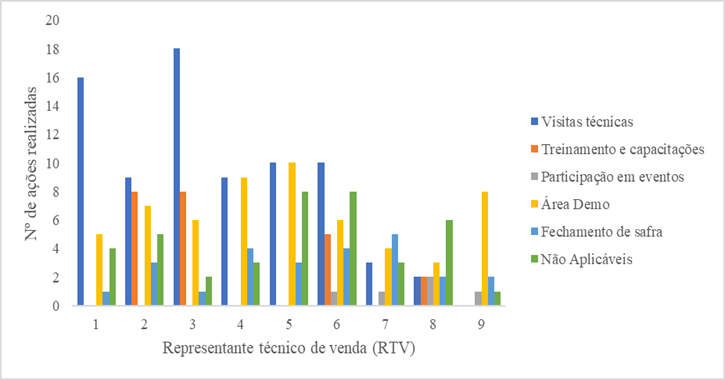 Além disso, nota-se que o RTV com menor faturamento em 2022 foi o RTV 03 (U$ 283.470,00), enquanto, em 2023, foi o RTV 08 (U$ 32.800,00) (Tabela 1). Em 2022, o RTV 03 concentrou-se prioritariamente na realização de ações como visitas técnicas (Figura 1), possivelmente limitando sua abordagem e o fortalecimento do relacionamento com os clientes. Rozzett (2010) defende a ideia de que a empresa deve realizar de forma eficiente um conjunto de atividades capazes de gerar valor de forma diferenciada ao cliente e consequentemente, gerar demanda.