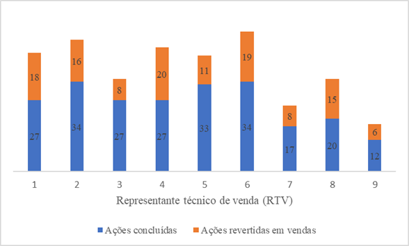 A figura 2 apresenta as ações concluídas e as ações que foram revertidas em vendas, reforçando o que é apresentado na Tabela 2, com destaque para o RTV 04, onde reverteu 20 das 27 ações programadas em vendas efetivamente.
