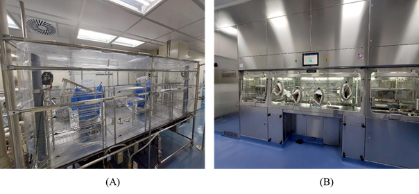 Os RABs, sistemas de barreiras de acesso restrito (Figuras 6 A e B), têm o papel de evitar os riscos de contaminação, podendo se apresentar nos modelos ativo ou passivo. O RABs ativo possui filtros HEPA e unidades de ventilação no interior da barreira, enquanto o modelo passivo utiliza os filtros HEPA da própria sala limpa (ELSAID; PAZHAYATTI, 2024). Os RABs devem possuir um ambiente adjacente classificado no mínimo como Grau B, logo é fundamental a realização de estudos do fluxo de ar para confirmar a ausência do ingresso de ar na câmara proveniente do ambiente adjacente durante as intervenções (EUROPEAN COMMISSION, 2022).